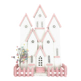 Large pink and white house with picket fence