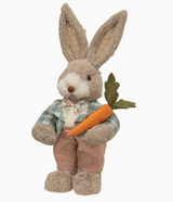 The Sisal Boy Bunny is dressed in a teal gingham jacket, floral bow tie, and soft pink tweed trousers. He holds a bright orange carrot with green felt leaves, giving him classic springtime charm.