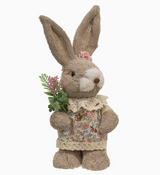 The Sisal Girl Bunny features a sweet floral dress with delicate lace trim and a soft pink blossom tucked at her ear. She carries a petite bouquet of pink and green faux florals, adding a fresh, garden-inspired touch to mantels, shelves, and tabletop displays.