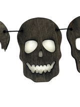 Wooden skull garland about 6 ft long. Each skull measures 4.5" tall. Crafted & assembled in Richfield, UT