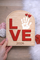 This timeless 3D Valentine keepsake features bold raised lettering spelling LOVE, accented with delicate heart details and a softly arched silhouette. Crafted from natural wood with dimensional red elements, this piece blends classic Valentine charm with a clean, modern feel.