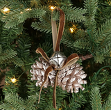 Champagne gold double pinecone ornament with ribbon bow. 4inWx2.5inL