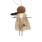 Plush pumpkin girl ornament with bat and fabric string for hanging